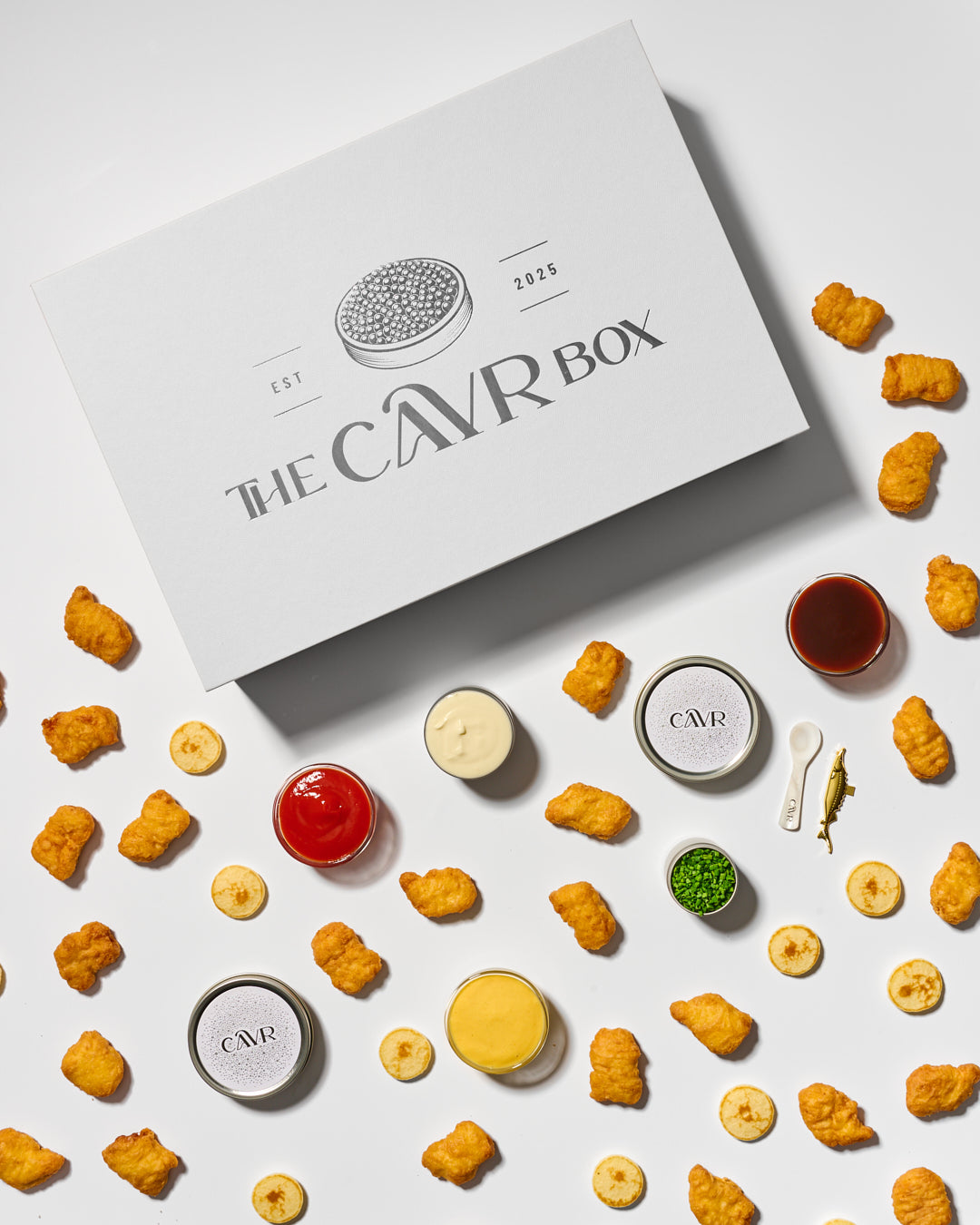 OUR SIGNATURE NUGGET BOX INCLUDES 25 OR 50 FRESH HANDMADE CHICKEN NUGGETS WITH YOUR CHOICE OF SIBERIAN SUPREME, OSETRA CASPIAN ROYAL, KALUGA IMPERIAL, KALUGA GOLD, OSETRA GOLD, OR BELUGA HYBRID CAVIAR. A 24K GOLD-PLATED TIN OPENER, A MOTHER OF PEARL SERVING SPOON, HANDMADE BLINIS WITH CRÈME FRAÎCHE AND CHIVES.